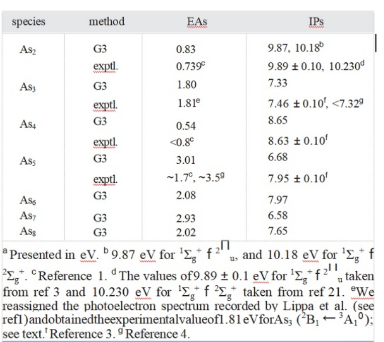 Table 1.Zero-Point Vibrational Energy (ZPVE)Cor-rected Adiabatic Electron A区nities(EAs)and Adia-batic Ionization Potentials (IPs)for Asn(n=2-8)a