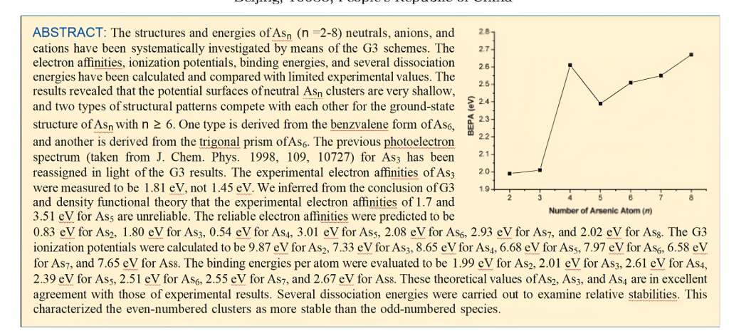 Over the past two decades,the compounds of ar-senic have been studied experimentally and theo-retically because they have been used as pigmentssince ancient times and used as compo-nents tomodify the mechanical properties of lead andcopper alloys and to eliminate unwanted colorationof glasses in modern industries.1,2 The arsenicclusters have played prominent roles not only inthe early development of both forensics and chemo-therapy but also in many diferent fields of modernscience,such as solid-state physics,biochemistry,physical chemistry,surface phenomena,and catal-ysis.1-17 The knowledge of the fundamen-tal prop-erties,such as the ground and low-lying electronicstates of neutral and charged arsenic clusters,elec-tron a区nities (EAs),and ionization potentials (IPs),should lead to a more complete understanding oftheir role in many diferent fields.With this motiva-tion,we have carried out a detailed study of thestructures and properties of neutral and chargedarsenic clusters by means of the higher level of theGaussian-3(G3)theory.18,19