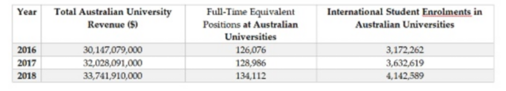 Table 1:Total Australian University Revenue, FTE Positions,and International Student En- rolment Data