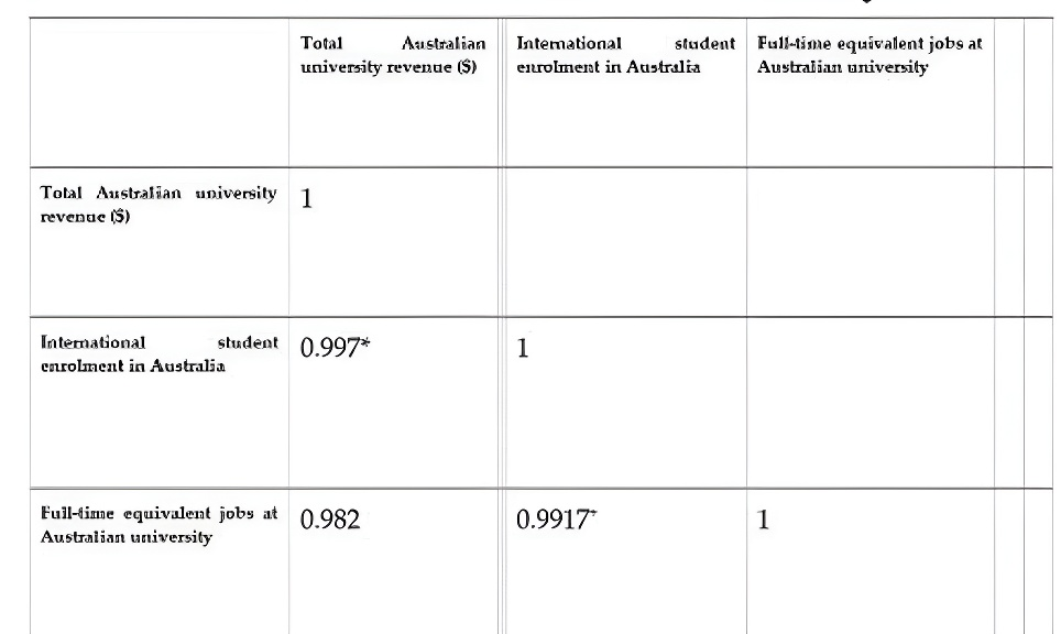 Based on our data from Table 1,we produced a correlation matrix that can be seen in Table 2.Table 2 highlights that there is a linear rela- tionship between total Australian university revenue and FTE employment positions at Australian universities.This is informed by the positive correlation coefficient of 0.982 be- tween these two variables.Similarly,we show that there is a positive linear relationship be- tween total Australian university revenue and the number of international student enrol- ments in Australian universities,as highlight- ed by the correlation coefficient of 0.997 in Table 1.The p-value in Table 2 determines whether the relationship between the depen- dent variable and independent variables are statistically significant and as such can be used to test our hypotheses.