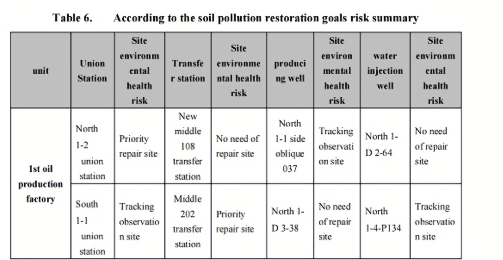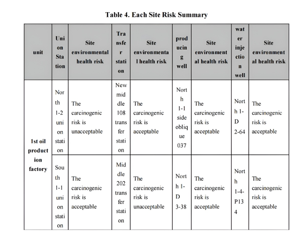 Risk assessment results show that total petroleumhydrocarbons in soil at part of sites have high healthrisk on the station staff,including the North 1-2united station and center 202 oil transfer station.