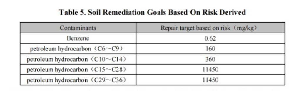Based on the risk assessment,the main concernedcontaminates of the site are benzene and total petro-leum hydrocarbons.Risk-based remediation targetare derived from calculation:Benzene(0.62 mg/kg);total petroleum hydrocarbons(C6~C9:160 mg/kg;C10~C14:360 mg/kg;C15~C28:11450 mg/kg;C29~C36:11450 mg/kg).