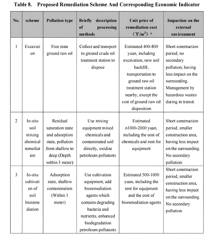 In combination with characteristics of petroleumcontaminated sites at Daqing Oil Field and existingconditions in the oil field,a set of soil remediationschemes were selected based on investigation of al-ternative remediation scheme,shown in Table 8: