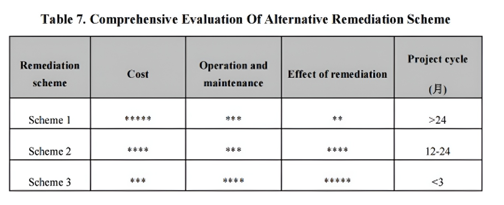 Note:—Evaluate weights;The more number ofsymbols,the better evaluate level which schemeachieved.Due to widespread uncertainly of site re-mediation,project cycle is mainly point at the con-centration of pollutants significantly reduce forin-situ remediation and ex-situ biological remedia-tion.The final project cycle depends on remediationobjective,hydrogeological characteristics of the site,pollutant characteristics and many factors,there isa certain degree of uncertainty.