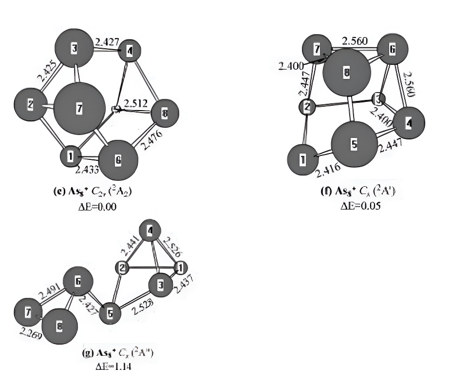 对于带正电荷的离子As6+,图5e-g展示了三种异构体。结构(e)呈现苯并戊烯型构型,具有C2v对称性且处于2B1基态。异构体(f)展现Cs对称性并处于2A00电子态,其能量比基态结构(e)高出0.20 eV。异构体(g)则具有C2h对称性,并处于2Ag电子态。