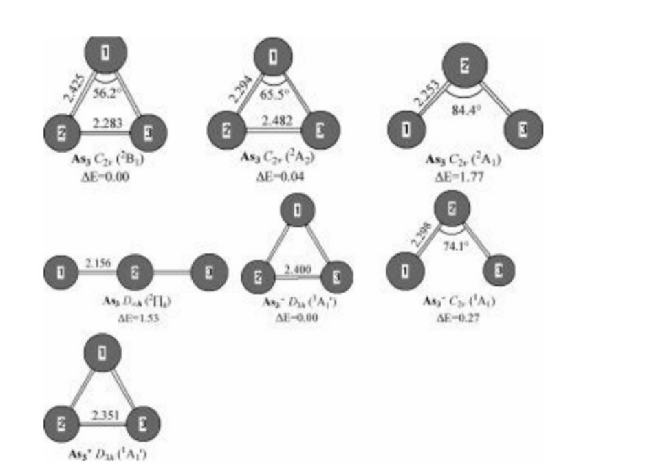 对于阴离子 As3 - 的基态结构,Zhao 等人[8]预测它是具有 C2v 对称性和 1A1 电子态的等腰三角形。Guo[6]预测它是等边三角形。