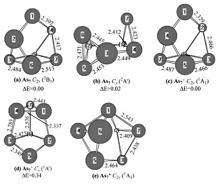 As7及其带电分子结构。图6展示了中性砷七的两种最低能量结构、阴离子态砷七的两种结构以及阳离子态砷七+的一种结构。对于中性砷七,其中一种结构(图6a)可视为用砷原子包裹砷六(As6)的三角棱柱;另一种结构(图6b)则可视为用砷原子包裹苯并二甲苯型砷六。被包裹的三角棱柱结构呈现C2v对称性且处于2B1状态,而被包裹的苯并二甲苯异构体则具有Cs对称性且处于2A0状态。从能量角度看,C2v结构仅比Cs结构稳定0.02电子伏特,这表明