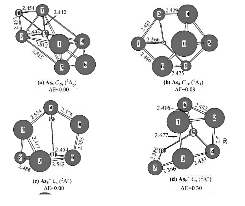 对于带负电的离子As₈⁻,图7c和图7d展示了两种异构体。结构(c)和(d)都具有Cₛ对称性和²A″电子态。从能量上看,在G3水平下,前者(基态结构)比后者稳定性高0.30 eV。这一结果与郭等人先前的研究结果不同。