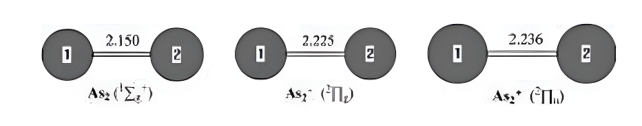 As3 及其带电分子。图 2 展示了中性 As3 的四种极小结构、阴离子 As3 - 的两种极小结构和阳离子 As3 + 的一种极小结构。从图 2 可以看出,中性 As3 的三种等腰三角形结构的电子态分别为 2B1、2A2 和 2A1 态。从能量上看,能量最低的 2B1 结构比 2A2 和 2A1 结构分别稳定 0.04 eV 和 1.77 eV。第四种异构体,即线性结构,具有 2Ig 电子态。从能量上看,它比 2B1 结构高 1.53 eV。我们注意到,在 Zhao 等人[8]和 Balasubramanian 等人[11]分别报道的各种密度泛函理论(DFT)和完全活性空间自洽场/多参考态单双激发组态相互作用(CASSCF/MRSDCI)水平下,2A2 态在能量上比 2B1 态稳定 0.02 - 0.05 eV。这意味着 2B1 和 2A2 电子态在竞争 As3 的基态。我们还注意到,Guo[6]报道 As3 的基态是线性结构。