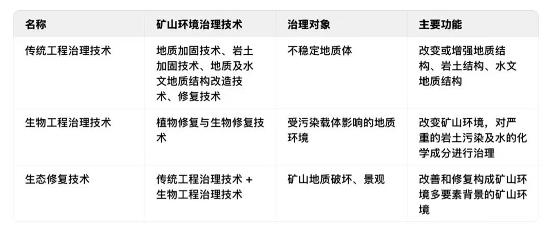 不同的治理技术具有各自的特点和适用范围。一般来说,应根据矿山环境的现状采用合适的治理技术。