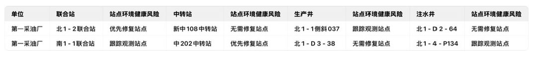 新 108 输油中转站、北 1 - D 3 - 38 和北 1 - 4 - P134:未发现污染迹象。
