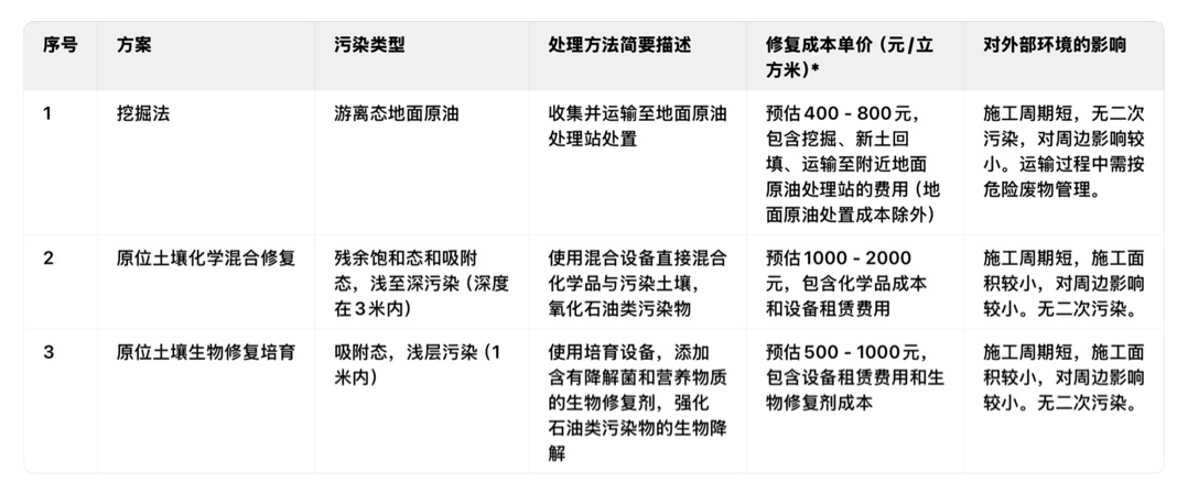 针对原油和含油污水污染的浅层至深层土壤,建议采用原位土壤混合化学修复方案;对于位于地下设施、管道等限制区域的污染土壤,建议采用系统控制与监测自然衰减相结合的修复方案。